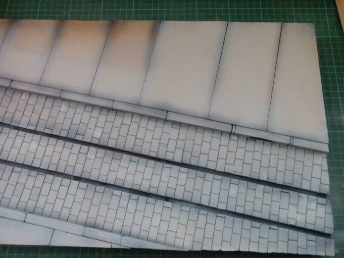Con pintura Vallejo Premiun color negro, ref. 62.020, aplicamos sombras en todas las juntas de la acera, así como en las juntas de los bordillos. También sombrearemos los canales para los raíles.